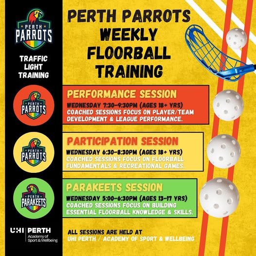 The Perth Parrots weekly training sessions, open for all to come and try Floorball – a growing team sport right on your doorstep! #JointhePandemonium