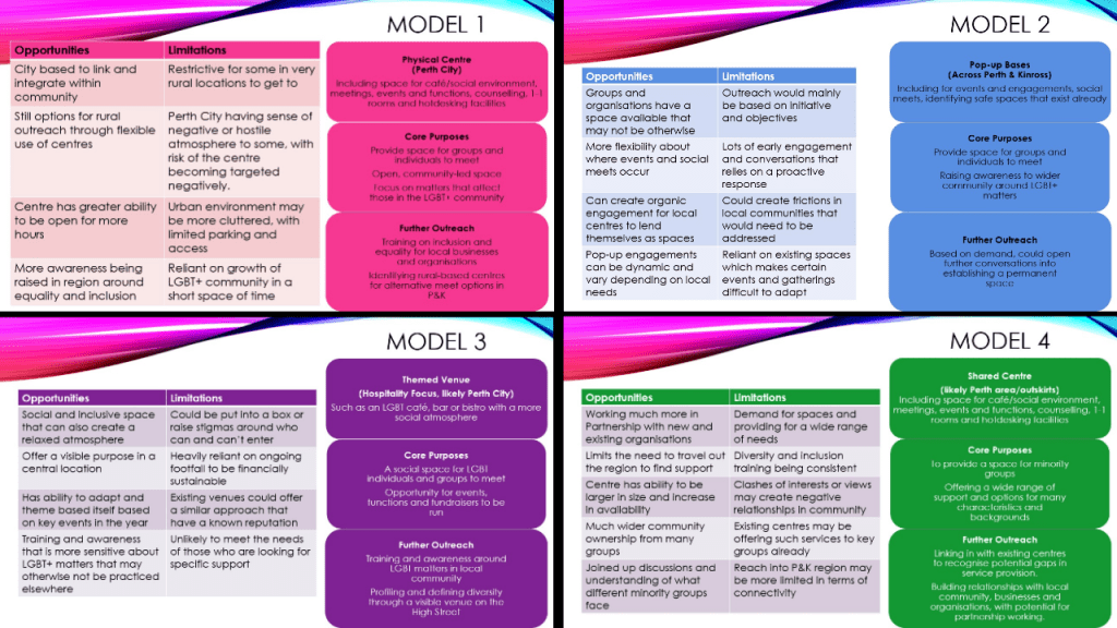 One of the key findings from this further consultation, we establish the need to build a sense of an LGBTQ+ community in Perth & Kinross, growing community engagement and activity on consistent basis. As well as this, it was felt that a 100 Day Plan would help towards progressing the idea of an LGBT+ hub into a reality.